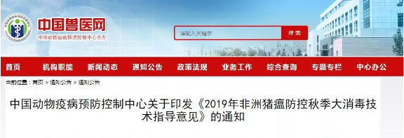 2019年10月22日,中國動物疫病預防控制中心為做好全國秋季“大清洗、大消毒”專項行動,起草了《2019年非洲豬瘟防控秋季大消毒技術指導意見》,指導養(yǎng)殖企業(yè)的秋季消毒工作。